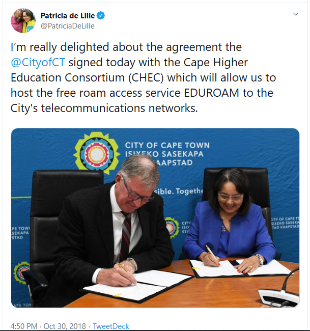 Patricia de Lille tweets of an agreement between the City and CHEC.